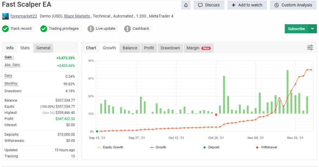 Fast Scalping EA is an automated trading system engineered for intraday scalping. It uses high-frequency logic, tailored algorithms and rapid order execution to capture micro-moves in the market. According to the provider, backtests and live results exhibit a total gain of +3,473.32% and an average monthly profit of around +99.83%. The EA avoids risky strategies such as Martingale or Grid, emphasising sustainable growth and capital protection.